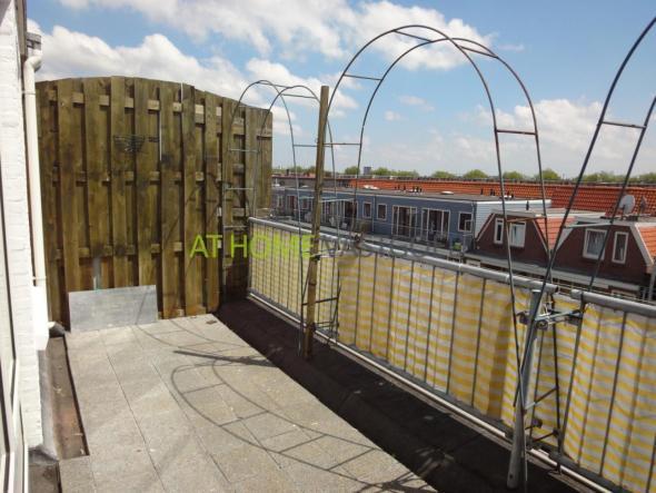 From the second floor you can take the stairs to the fourth floor where half the remaining two bedrooms, a separate toilet and new bathroom with shower and sink are located. The nice thing about this apartment is the large roof terrace at the back directly to the master bedroom. In a closet, the central heating system (2010) placed as well as the connection for the washing machine.