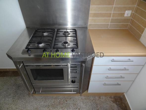 Fitted kitchen with refrigerator, stove, oven and dishwasher.