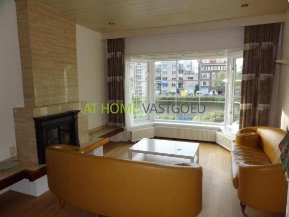 Woonkamer: 5.59 x 4.10 m. (22.80 m²), voorzien van 2 maal een 2.5-zits bankstel, openhaard, echt houten vloer, grote antieke kast, gordijnen, design lamp, uitbouwraam en tv meubel.