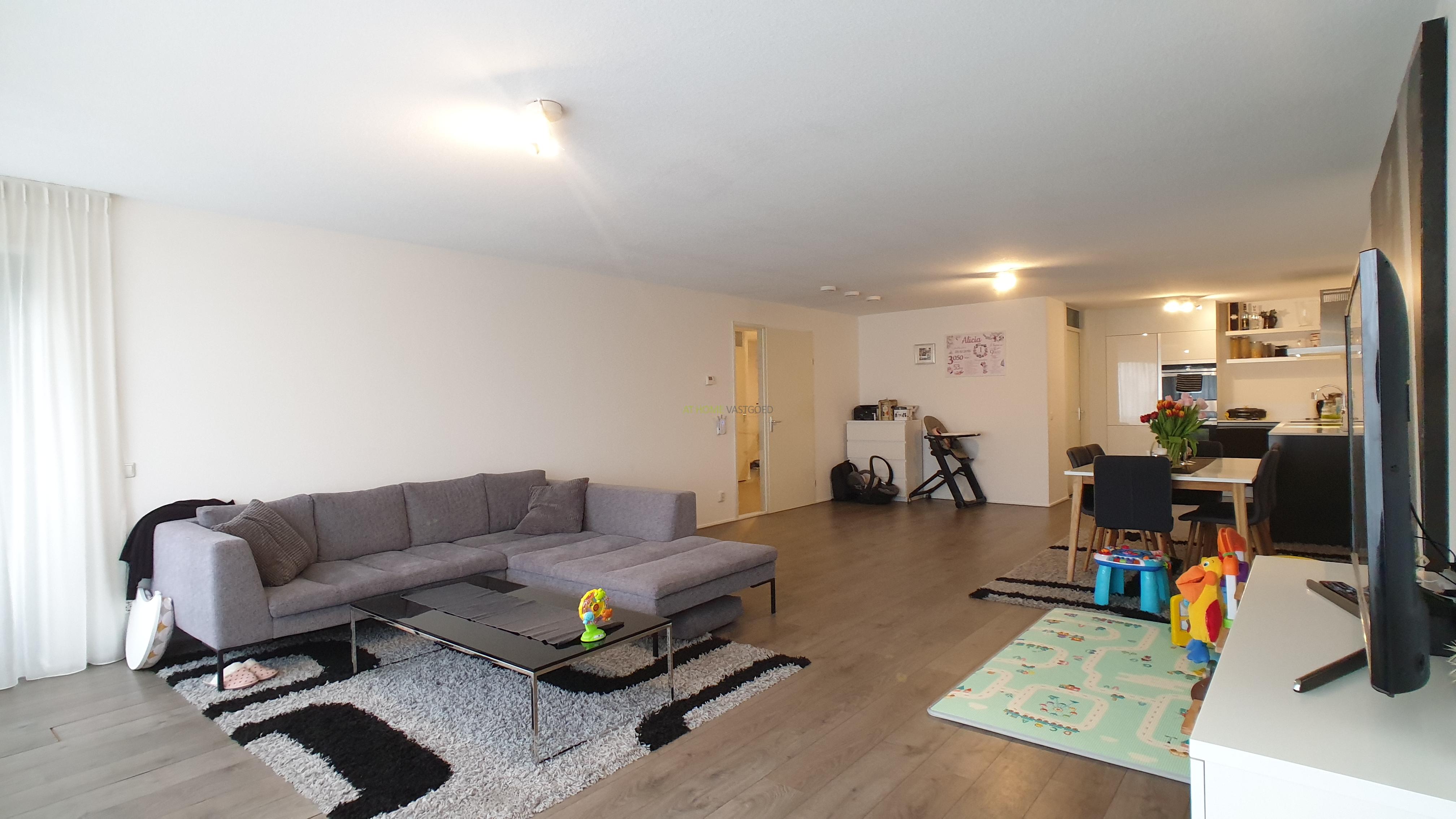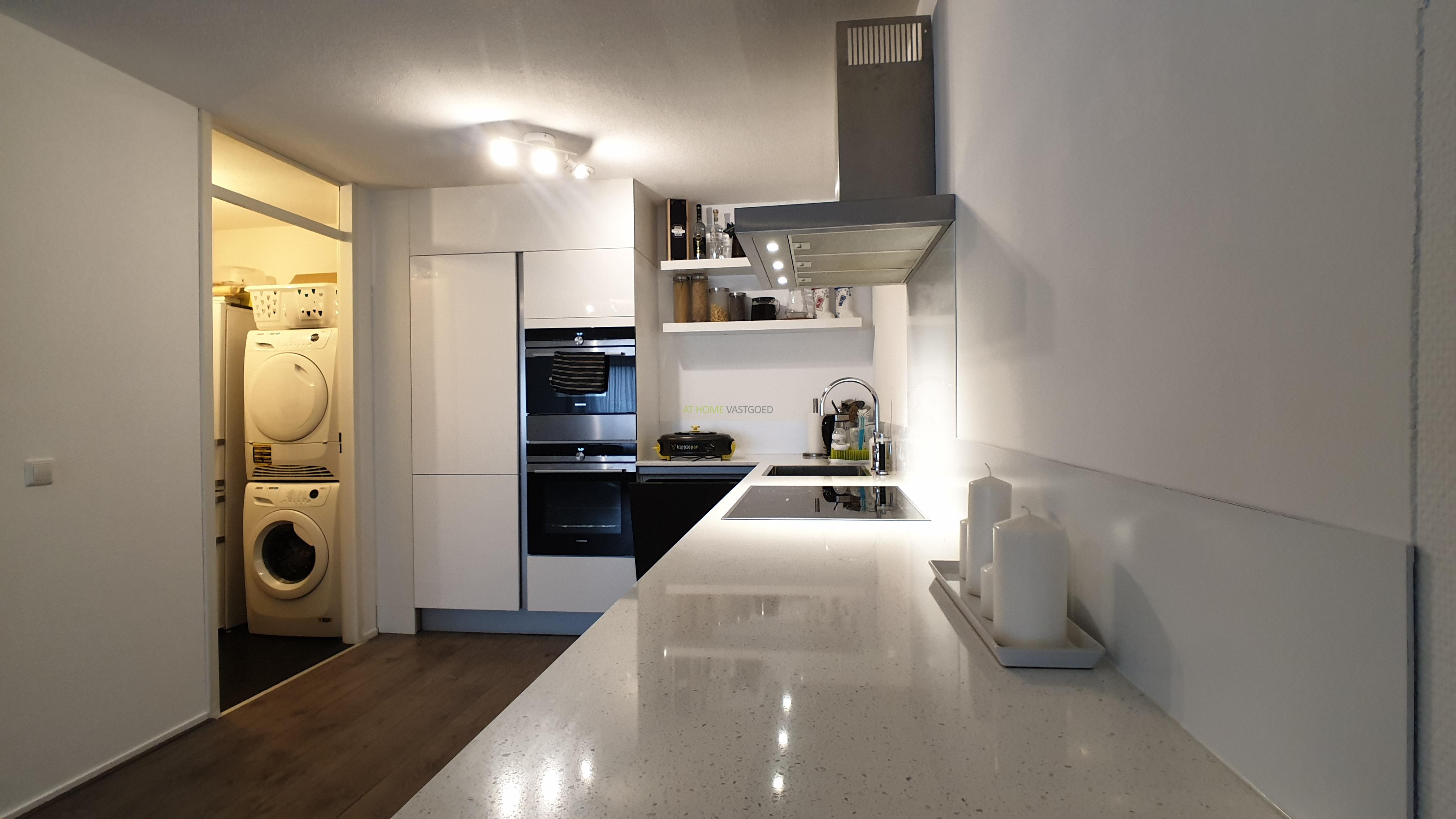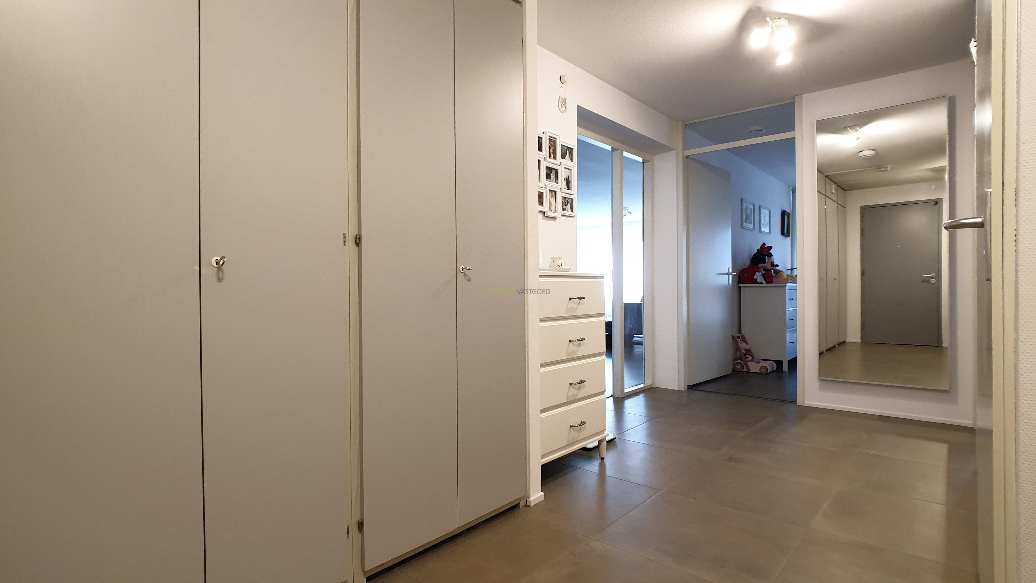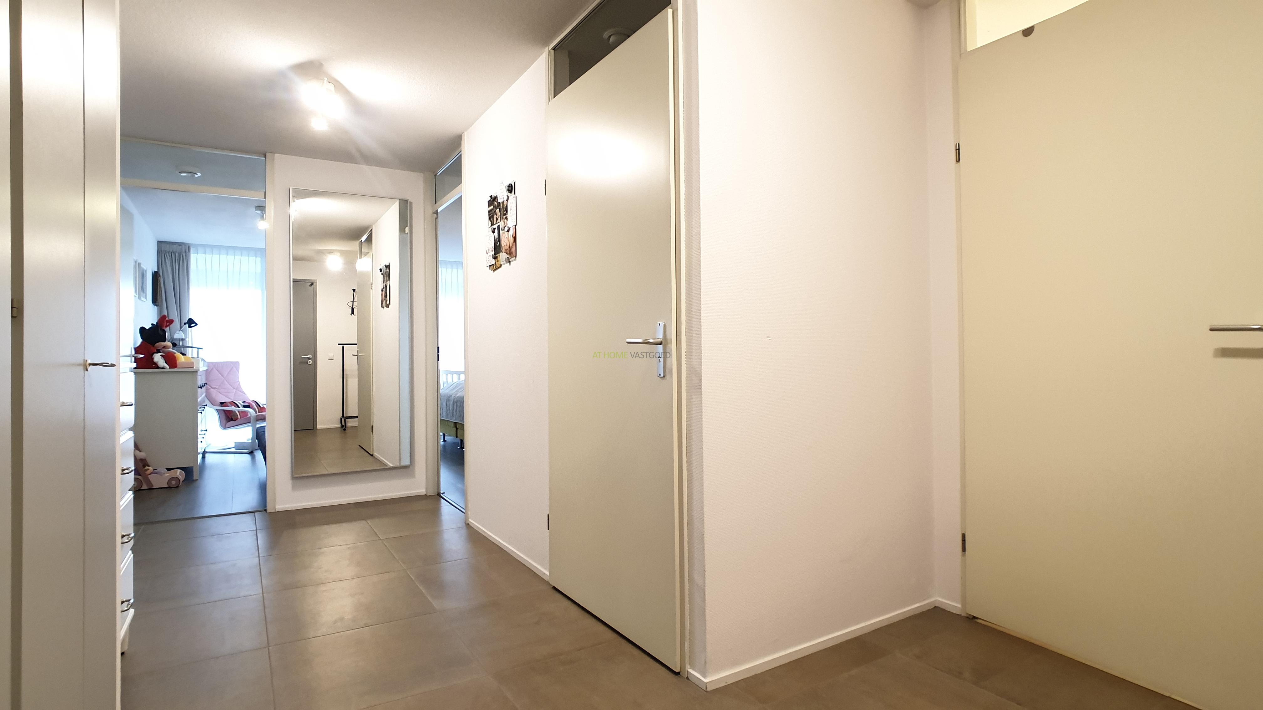 Entree, ruime hal, zeer riante en lichte woonkamer met prachtig uitzicht, prachtige open keuken welke van alle gemakken voorzien is met een keramische kookplaat, afzuigkap, koelkast/vriezer, combi magnetron, stoomoven en vaatwasser, met aangrenzend de bijkeuken/berging met wasmachine en droger. Luxe badkamer met heerlijk ligbad, inloopdouche en dubbele wastafel. Het toilet is apart gelegen. Beide slaapkamers zijn gelegen aan de voorzijde waarvan 1 zeer ruime slaapkamer en een iets kleinere slaapkamer. Het gehele appartement is voorzien is van een mooie laminaat vloer en nieuwe meubels.
