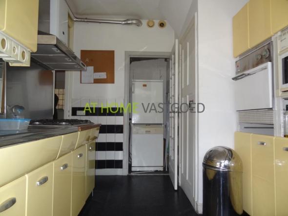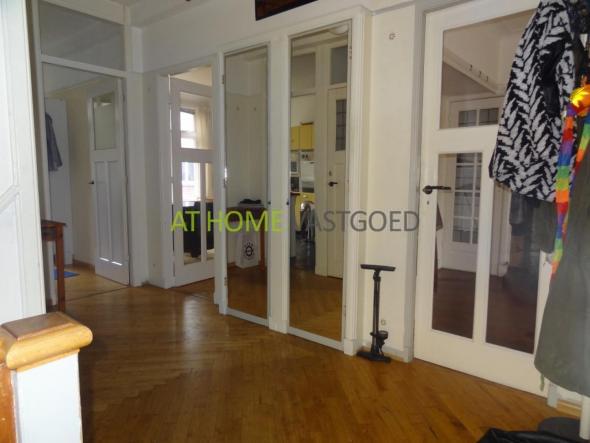 Trap naar de 1e etage. Ruime hall met veel licht inval en separaat toilet. Grote en lichte woonkamer in L-vorm met aansluitend de eetkamer. De American kitchen (Raymond Loewy) is voorzien van alle benodigde apparatuur en heeft een aparte ruimte voor de wasmachine en droger. De badkamer is voorzien van wastafel en douche. Vanuit de badkamer heeft u toegang tot het balkon.
