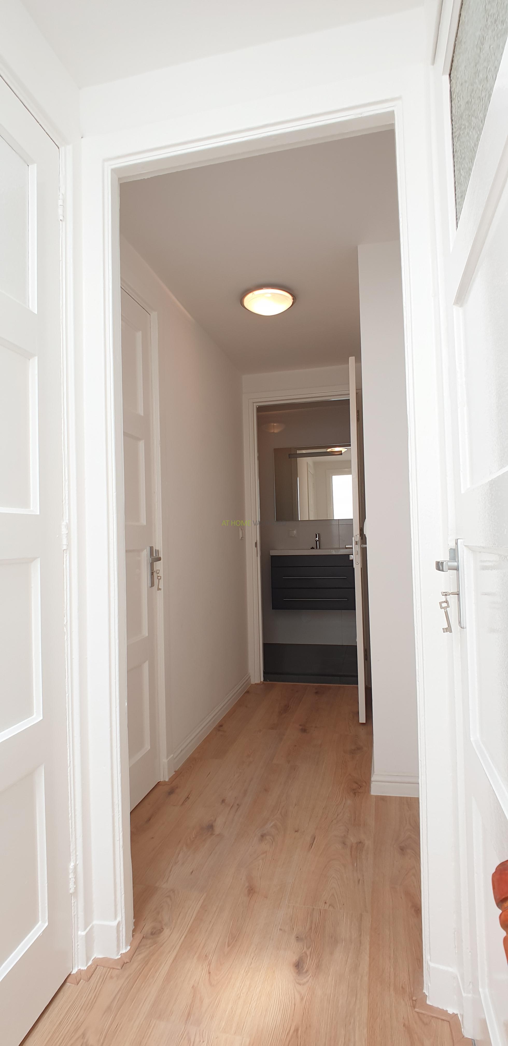 Overloop, 1 ruime slaapkamers en 1 kleine slaapkamer, beide slaapkamers bieden toegang tot het riante dakterras, zeer nette volledig betegelde badkamer voorzien van douche en wastafel met spiegel en meubel en apart nog een 2e toilet.