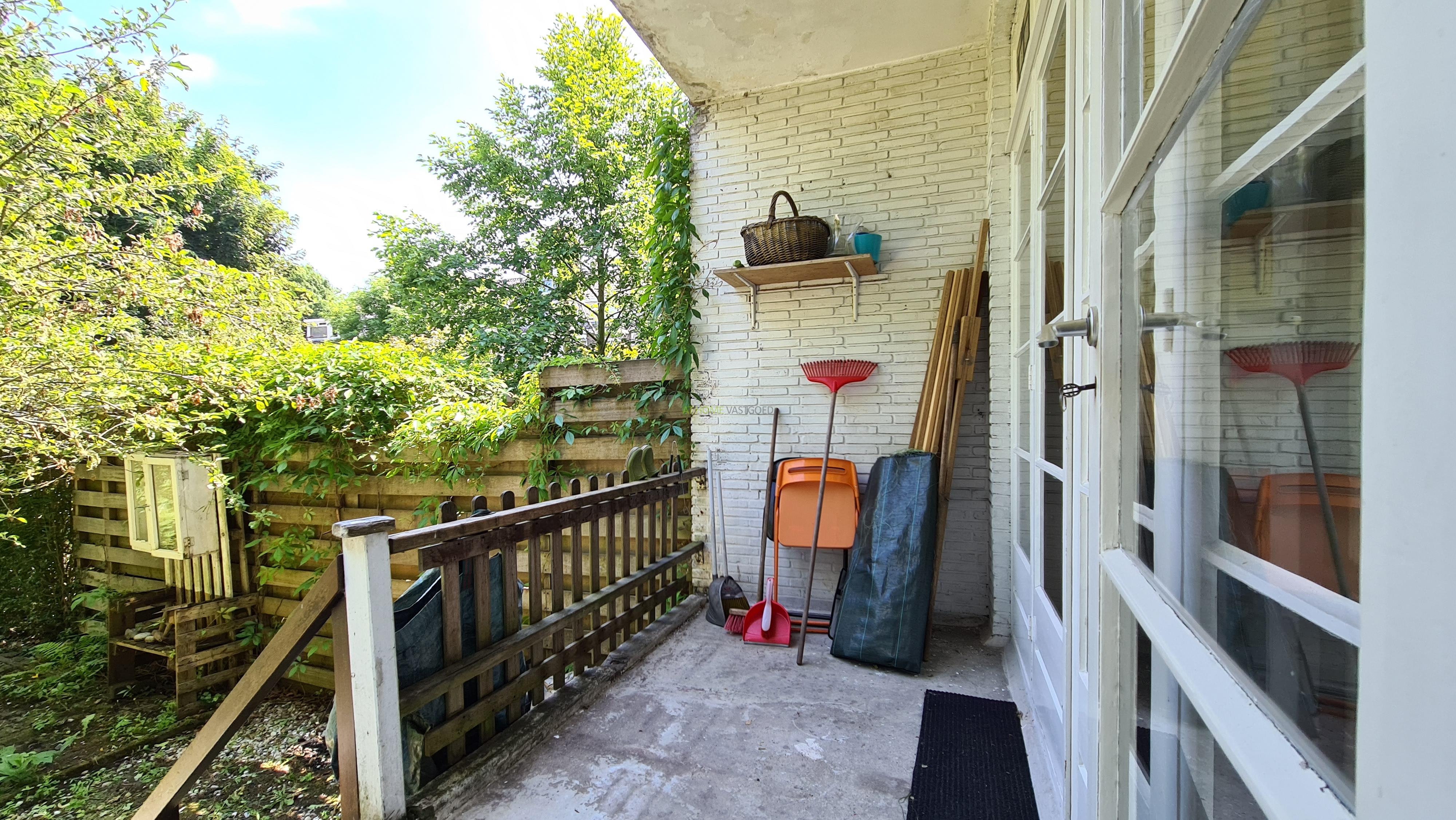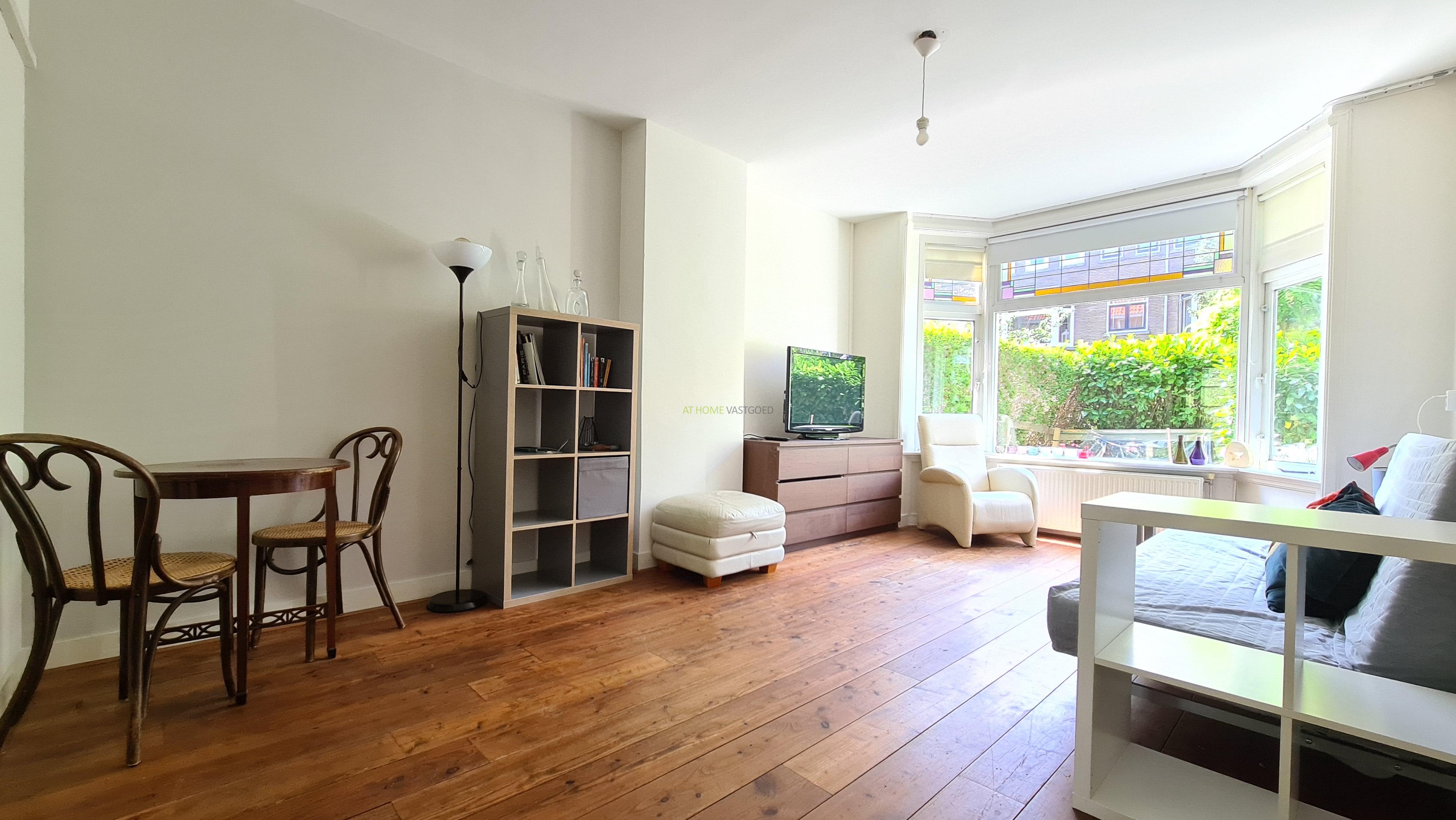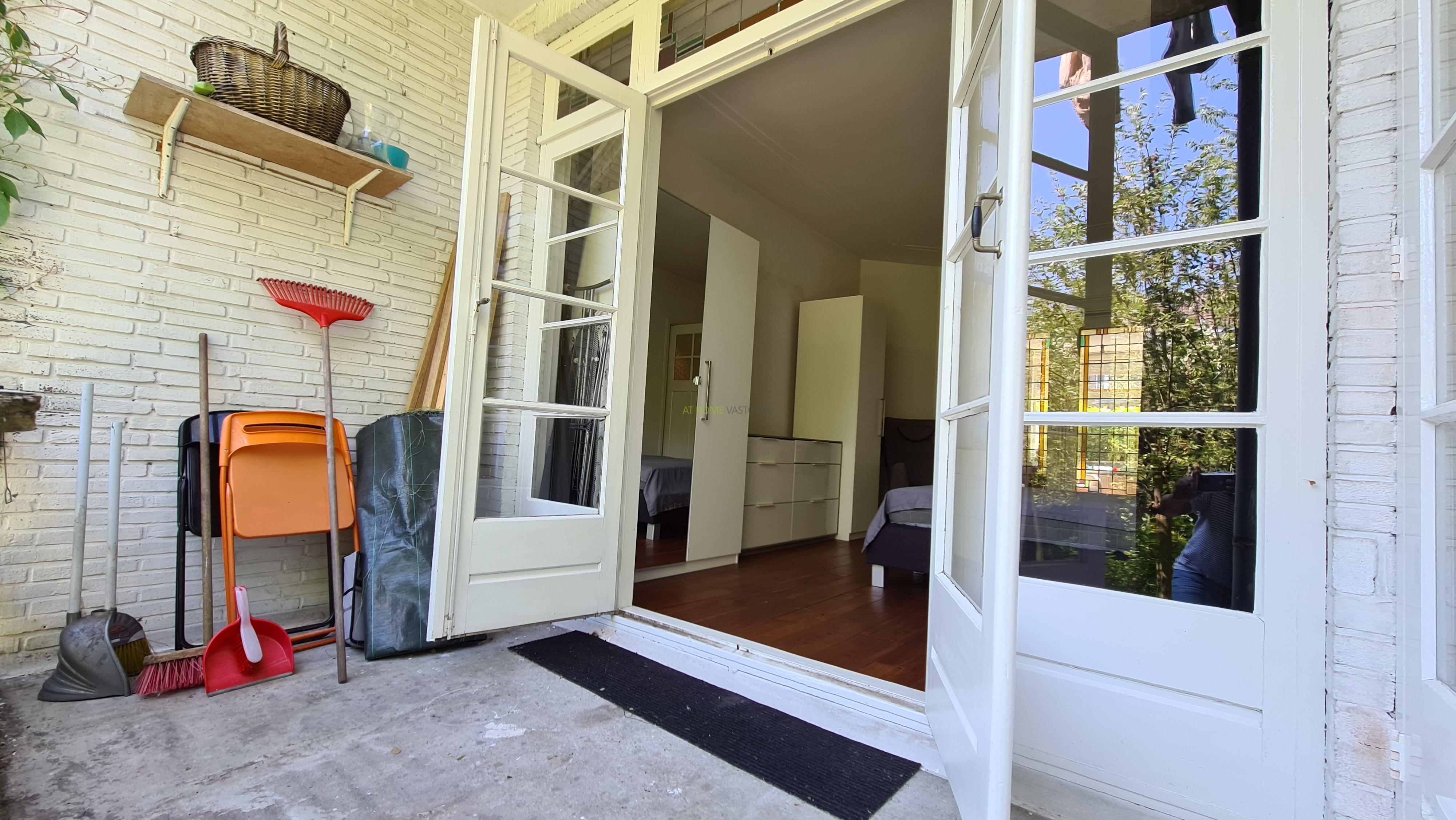 Entree, tocht portaal, hal met bergkast en separaat toilet. Knusse en lichte woonkamer met erker, slaapkamer ensuite welke middels schuifdeuren (glas in lood) is te bereiken. De slaapkamer biedt via openslaande deuren toegang tot het terras en heerlijke, zonnige tuin, gelegen op het noordoosten. De aparte keuken is voorzien van gaskookplaat, afzuigkap, oven, koelkast, vriezer en geeft tevens toegang tot de tuin.