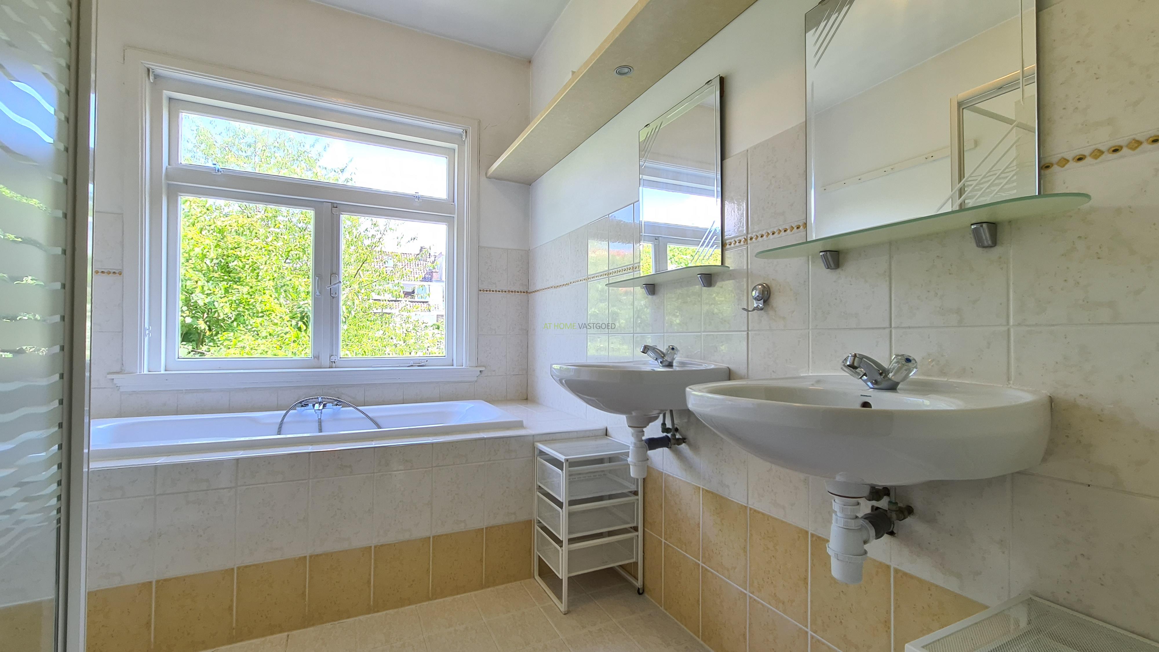 Overloop, ruime badkamer voorzien van ligbad, aparte douche, dubbele wastafel en wasmachine.