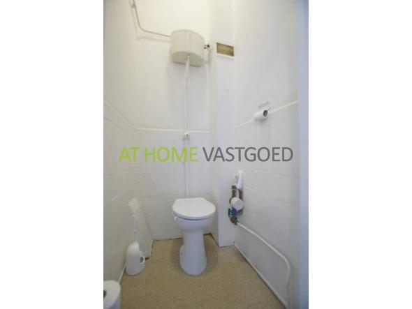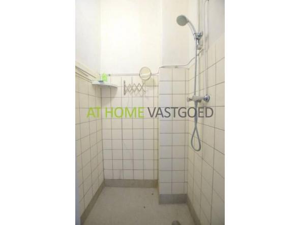 Kleine badkamer met douche. Apart toilet. Het appartement is gemeubileerd met bedden, garderobekasten, bureaus met stoelen en boekenkasten.