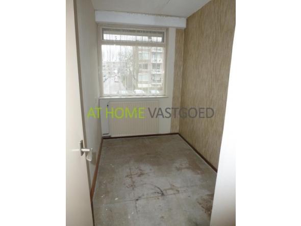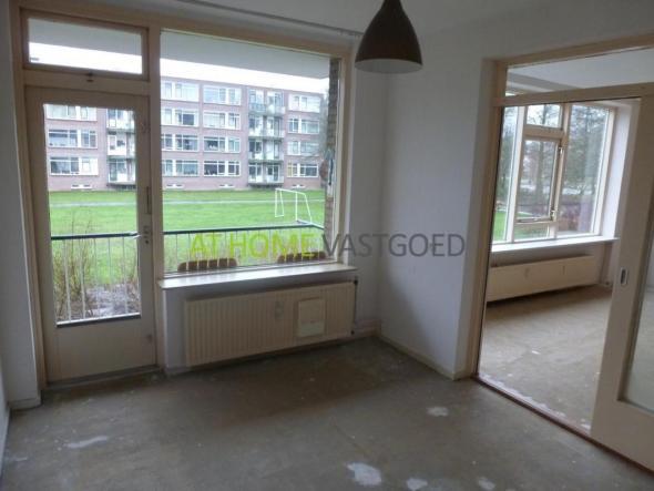 entree, tocht portaal, hal, bergkast, meterkast. Volledig betegeld toilet met fonteintje. Riante woonkamer (ca. 5.46 x 4.57m) met toegang tot de eetkamer/slaapkamer (ca. 3.94 x 3.01m). Deze kamer biedt toegang tot het balkon aan de achterzijde van het appartement. Gesloten keuken (ca. 3.83 x 1.81m) welke is voorzien van een eenvoudig doch net keukenblok met diverse bovenkasten en elektrische boiler (80L). 2 slaapkamers (respectievelijk 5.18 x 2.70m en 3.44 x 1.80m).