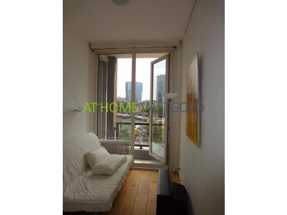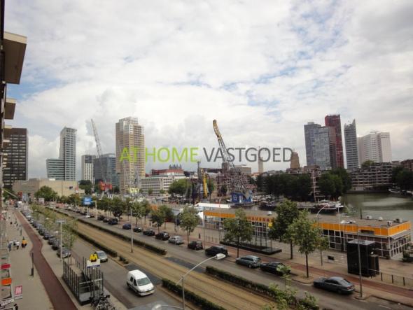 Hal, Toilet, meterkast, badkamer. Vanuit de hal komt u in de royale woonkamer die voorzien is van grote ramen waardoor er heel veel lichtinval is en u een fantastisch uitzicht heeft op de Leuvehaven en andere mooie gebouwen van Rotterdam. Dit appartement is compleet gemeubileerd en voorzien van een mooie houtenvloer, loungebank, lcd tv, eettafel en stoelen, inbouwkasten, stadsverwarming,dubbele beglazing. Tevens heeft dit appartement prachtige hoge plafonds wat een ruimtelijk gevoel geeft.Slaapkamer 1 is voorzien van een 2 persoonsbed en inbouwkasten. Slaapkamer 2 is voorzien van een slaapbank voor 2 personen. De keuken is modern ingericht en voorzien van een, 4-pits gaskookplaat met ingebouwde oven, afzuigkap koel/vriezer en voeldoende kast ruimte.