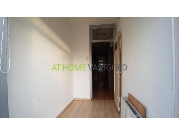 1e verdieping: entree, hal met toilet en inbouwkasten, vaste trap naar de derde verdieping. De ruime lichte woonkamer met vaste kasten geeft toegang, middels schuifdeuren, tot de kamer en suite. Deze kamer kan goed worden gebruikt als slaapkamer of eetkamer. Knusse slaapkamer aan de voorzijde, deze biedt via openslaande deuren toegang naar het 2e balkon. Nette afzonderlijke keuken voorzien van gaskookplaat, afzuigkap en toegang tot het eerste balkon.
