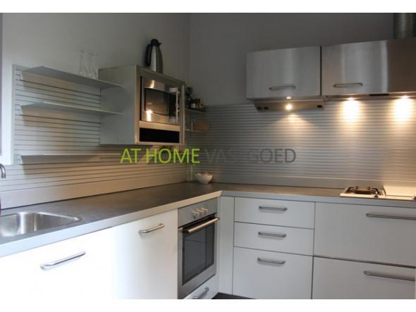 Spacious living/dining room with nice wooden floor, open fire place, luxurious open kitchen with built in equipment.