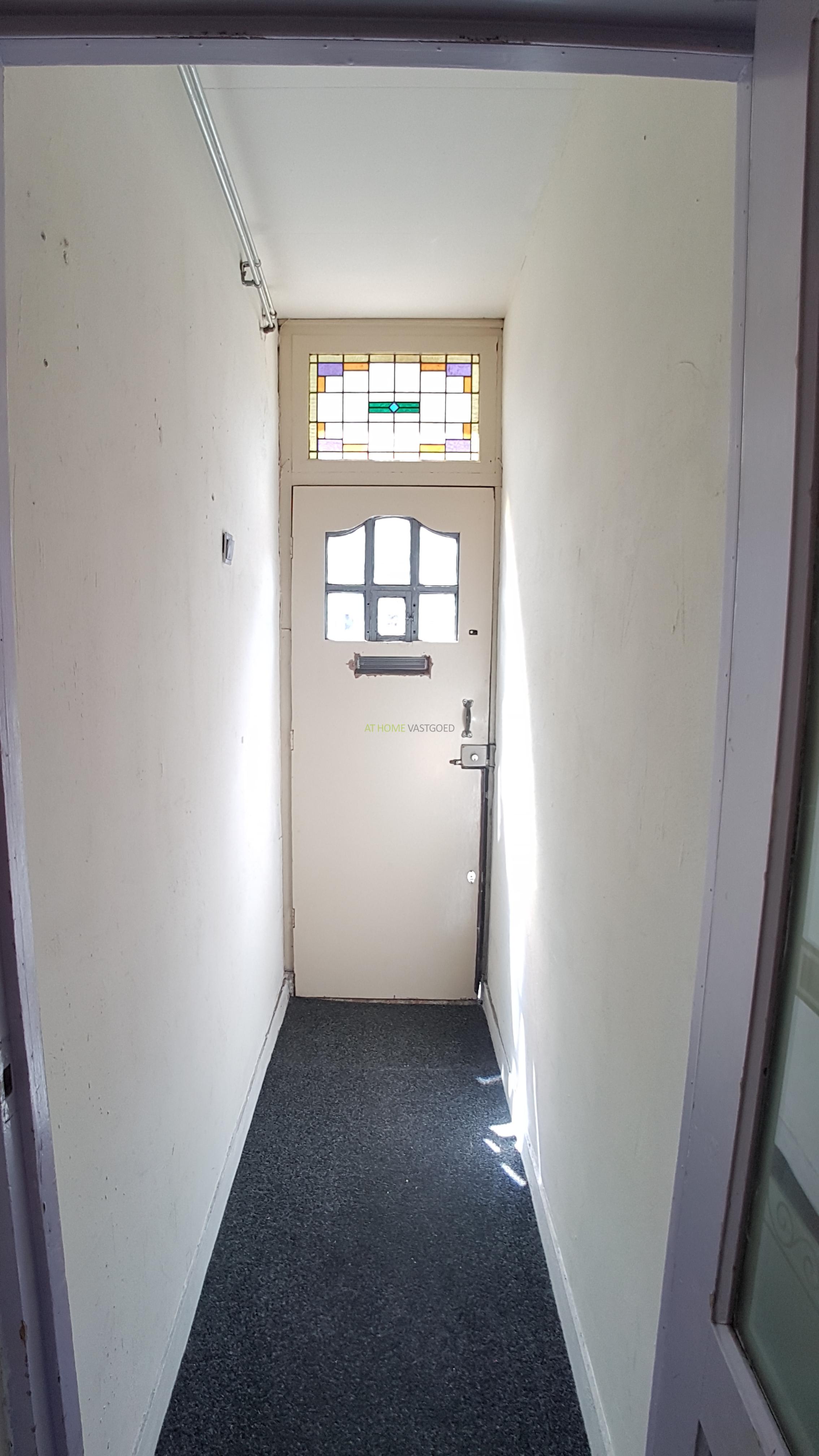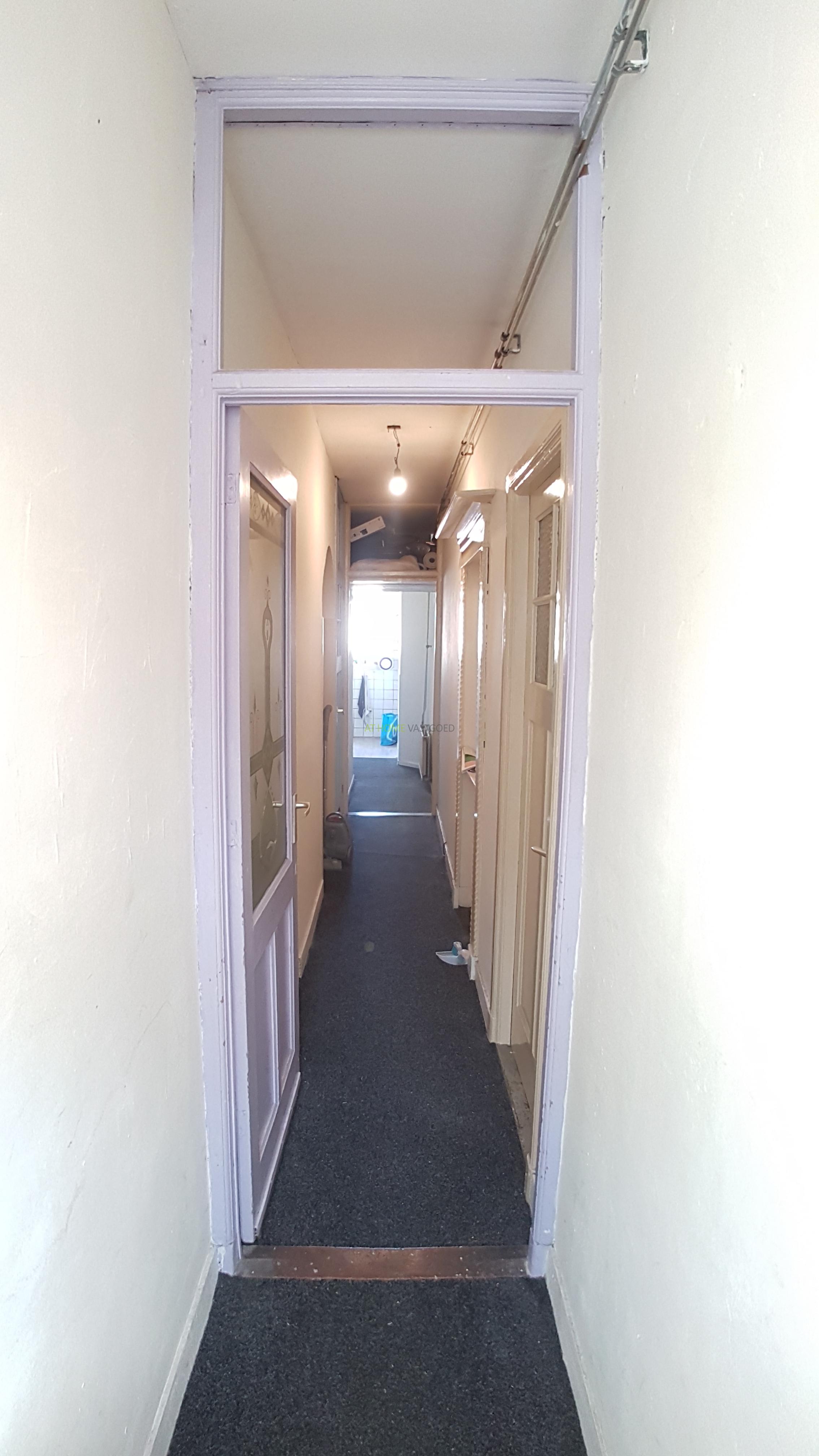 Gezamenlijke entree, hal met toegang naar alle vertrekken, ruime kamer, apart toilet, badkamer met douche en keuken.