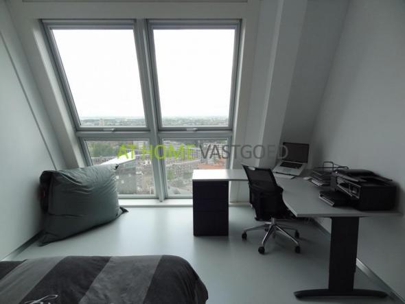 Lift naar de 21e verdieping. Ruime hal van waaruit u toegang tot alle kamers heeft. Apart toilet en wasruimte. Zeer ruime en lichte woonkamer met open keuken welke is voorzien van alle benodigde apparatuur. De woonkamer heeft een hoog plafond van een ongekende 7 meter en biedt een panoramisch uitzicht over de stad Rotterdam. Op deze verdieping is er een ruime slaapkamer met een prachtig uitzicht en een eigen badkamer met ligbad en wastafel.
