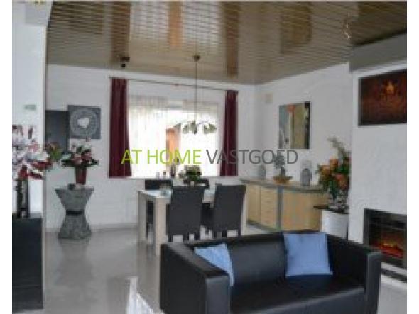 - L-vormige woonkamer met open haard en alle zijden ramen. Airco, plavuizen vloer met vloerverwarming, schuifpui naar voortuin.