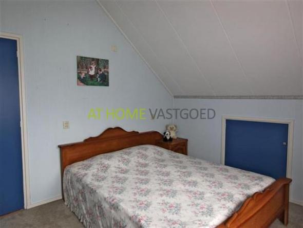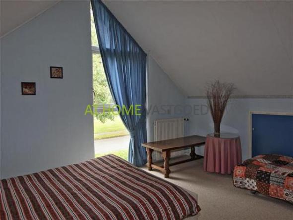 Verdieping: ruime overloop en 2 ruime slaapkamers waarvan 1 met een deur die toegang biedt naar het platte dak van de garage. Vanaf de overloop is de grote badkamer met ligbad en 2e toilet toegankelijk. Achter de knieschotten is veel bergruimte aanwezig.